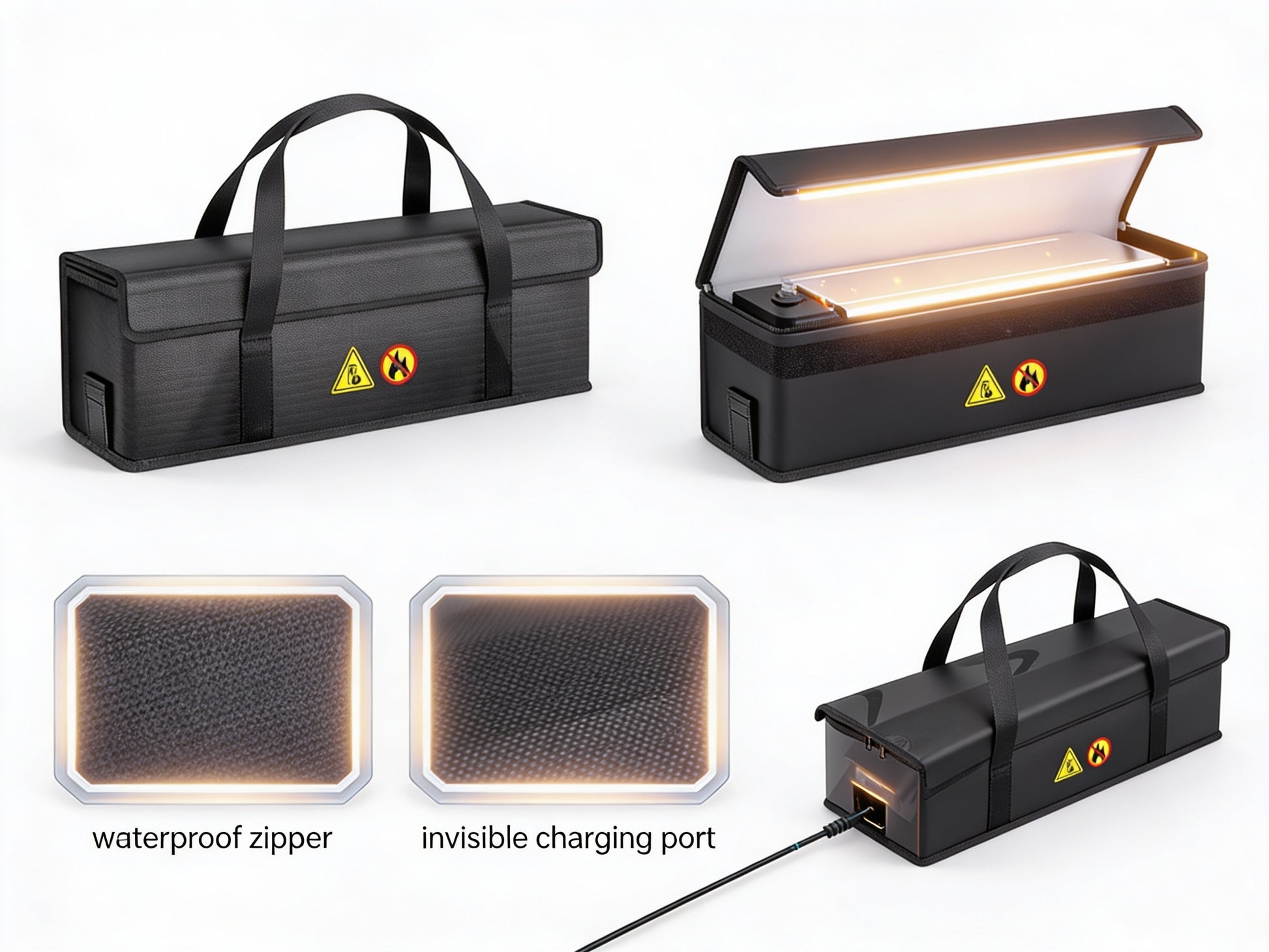 Constructed using a three-layer protective system (liquid silicone fiber cloth, heat-insulation layer, and fiberglass cloth), designed to withstand temperatures up to 2200℉ / 1250℃ during battery charging.